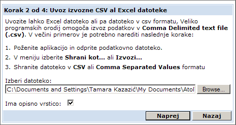- Prva vrstica v vaši datoteki naj vsebuje imena stolpcev, saj boste tako lažje naredili povezavo med podatki v datoteki in polji v sistemu