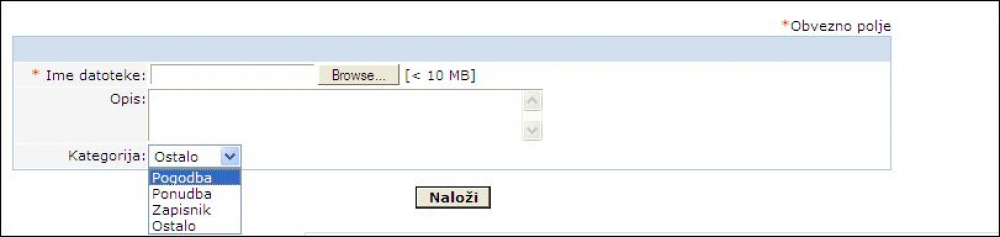 S klikom na gumb „Browse“ na svojem računalniku poiščemo datoteko, ki jo želimo shraniti. V „Opis“ napišemo ime datoteke. Kot Kategorijo izberemo „Zapisnik“. Kliknemo na gumb „Naloži“ .