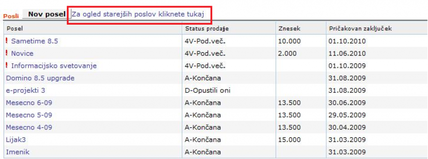 Običajno imamo na eni stranki, obešenih več poslov. Kadar je število poslov veliko, se na stranki vseh ne vidi. Zato za vpogled v starejše posle kliknemo na ikono Za ogled starejših poslov kliknete tukaj, preko katere se nam odpre pregled vseh poslov, ki so vezani na željeno stranko. Na ta način je iskanje poslov hitrejše, enostavno in bolj pregledno.
