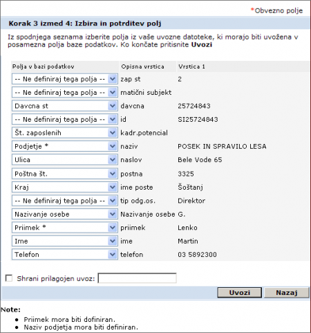 If you need to repeat imports it is recommended to save this import's model. In this way you will not have to link the fields again. Mark the Shrani prilagojen uvoz field and name it. Be careful to use a not yet used name. You can choose prilagojen uvoz at then next, 2nd step.</note>