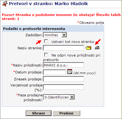 Če označite polje, bosta po pretvorbi nastala le nova stranka in kontakt. Nov posel ne bo nastal.
