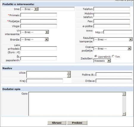 In this field can be entered rezultat kampanje, s katero ste interesente pridobivali. From pull down menu can be choosen , da se je interesent javil sam, da ga morate poklicati oz. obiskati vi, da ga v tem trenutku vaša storitev ne zanima ipd.