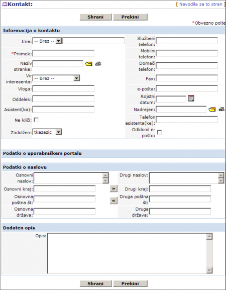 V polju zadolžen lahko iz seznama uporabnikov izberite skrbnika kontaktne osebe. Sistem privzeto označi za skrbnika tistega, ki zapis vnese.