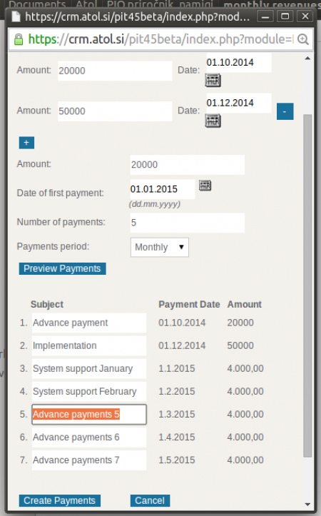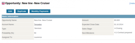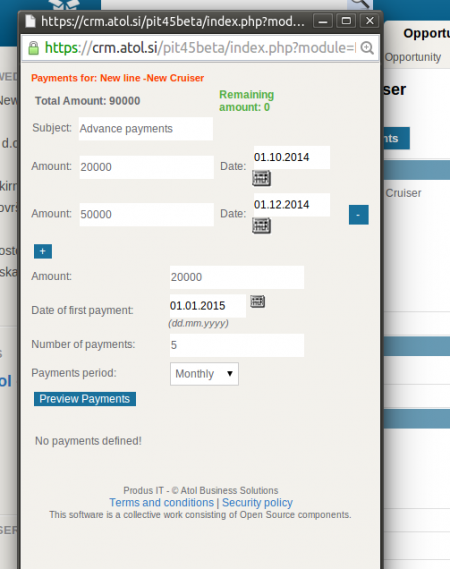 The simplest way to enter monthly payments is directly on Opportunity's detailed view. By pressing „Monthly Payments“ Button a dialog window appears.