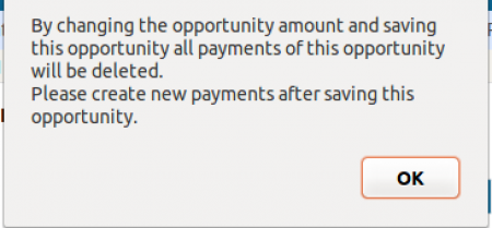 - Change the amount on the Opportunity = you will get a notification for your confirmation to delete all existing payments in case you decide to change the amount and save the opportunity - than you need to create the payments again properly (see the notification bellow)