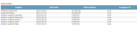 - Every payment is displayed in its own line, it displays, opportunity name, opportunity type, payment subject, absolute value of the payment, pondered value of the payment and assignee.