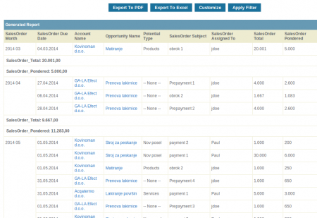 - It contains totals by month in absolute value and also in pondered value. The information for pondered values of monthly revenues is obtained on the opportunity in the field „Probability“.