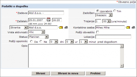 The second way of entering an event is by clicking New event on entry section. A new page opens to enter a new event (see form). The difference between the first and the second way of entering data is that here the data of Account is not transferred automatically. It has to be entered manually. Read more about how it can be done below.